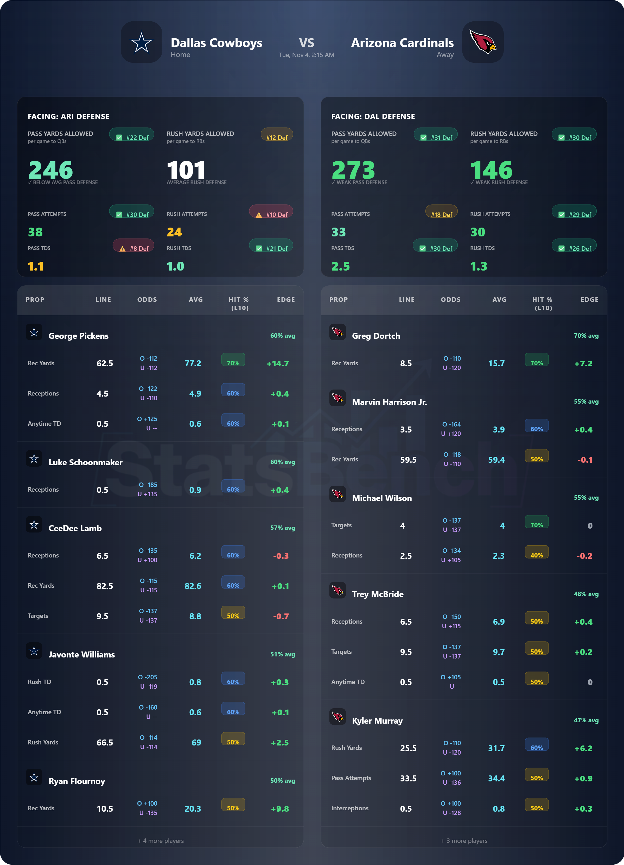 Two teams with plenty to prove meet under the lights — Dallas (3–4–1) aims to bounce back from a blowout in Denver, while Arizona (2–5) looks to end a five-game skid after the bye.