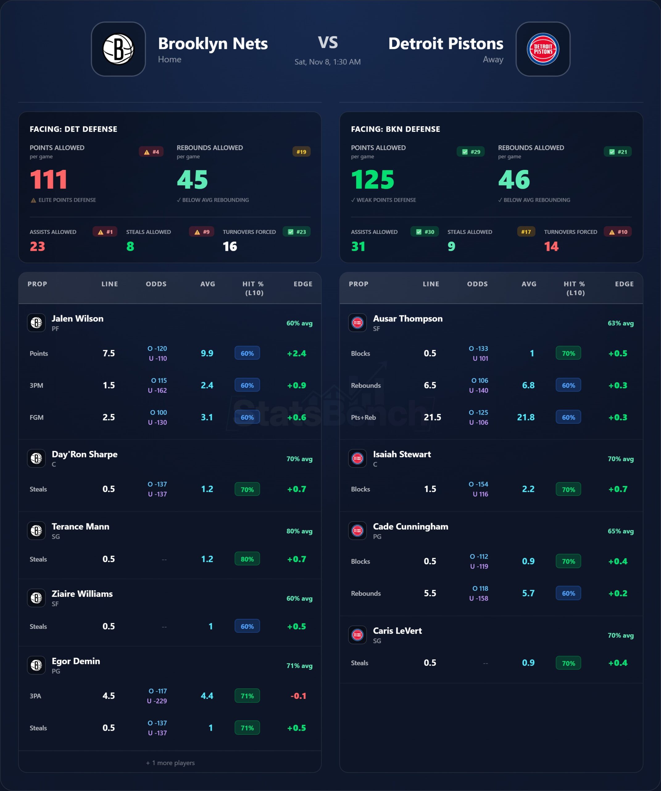 Matchup note: Expect Detroit’s rebounding edge to dictate the flow — Nets struggle vs. big frontcourts, giving Duren and Thompson multiple 2nd-chance looks.