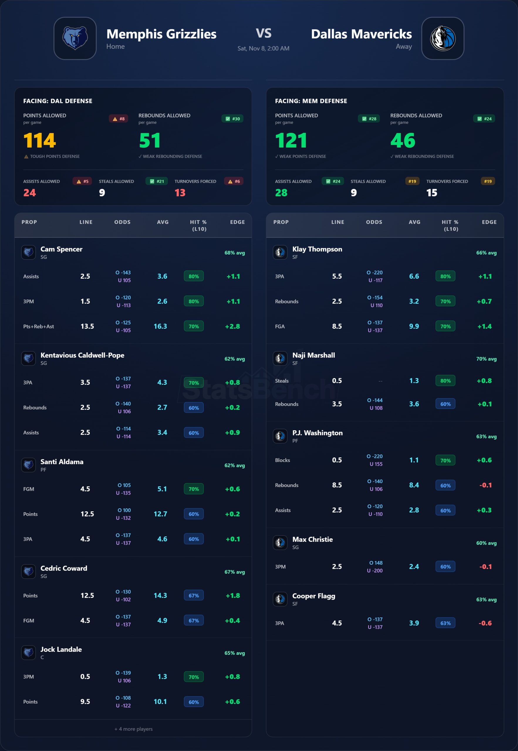 • DAL defense: allows 121 pts and 46 rebs per game on your sheet → second-chance chances for MEM if they actually drive/cut.