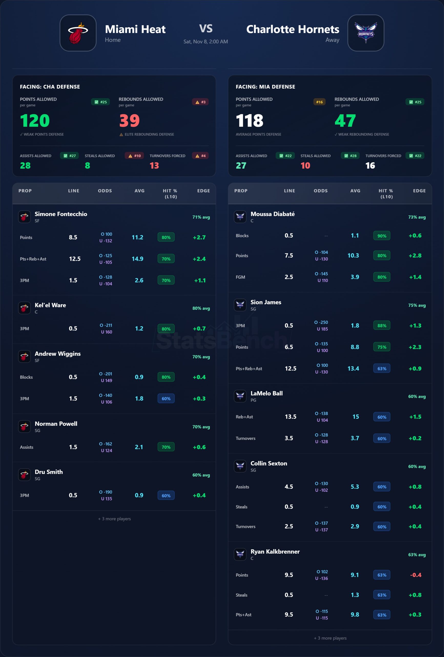 Read: Miami returns home from a road-heavy stretch without Bam and still missing Herro. Norman Powell (23.2 ppg, 51.7 3P%) is carrying usage, Kel’el Ware likely starts at the 5. Charlotte’s kids (Knueppel, Sion James, Kalkbrenner) are fun but volatile; LaMelo Q swings ceiling.