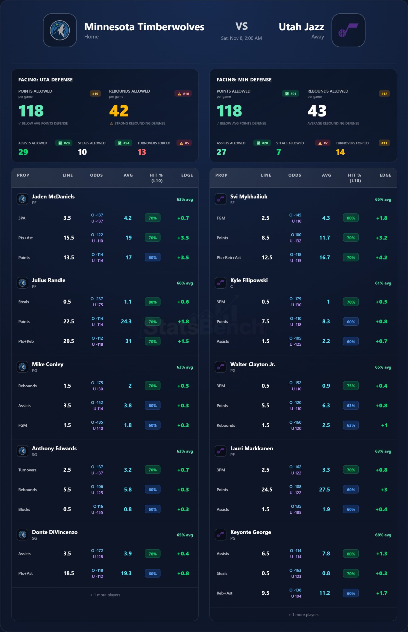 Read: Ant’s back and focused on defense; McDaniels likely takes Lauri. Wolves’ role guys are ticking: Jaden McDaniels shooting/boards, Conley table-setting, DiVincenzo connective play. Utah relies on Markkanen + rookies (Keyonte) + Svi’s shot-making.