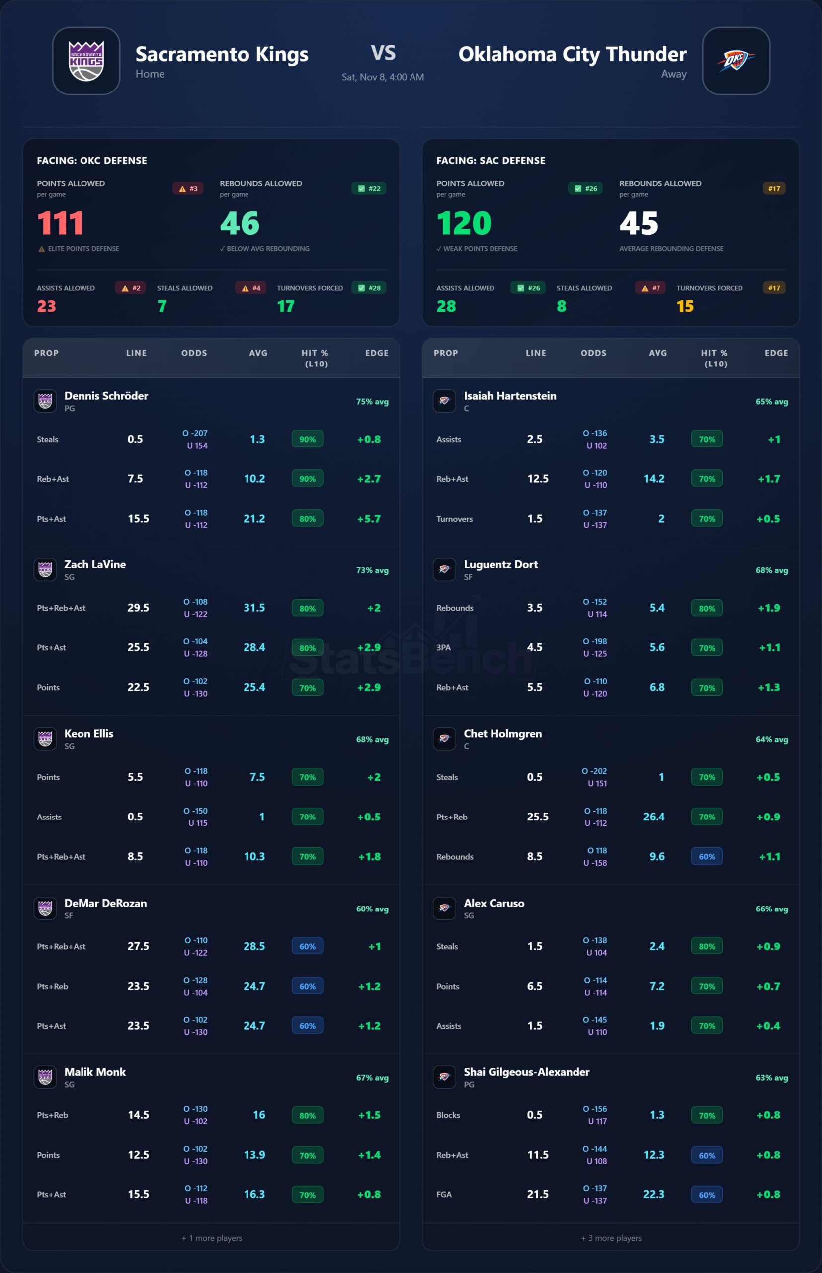 Read: OKC’s first loss came on the 2nd of a B2B; they’re still the sharper half-court defense. Sacramento’s injuries (Sabonis/LaVine/Keegan statuses) make perimeter creation paramount; Monk/DeRozan shoulder usage. OKC front line (Chet + wings) has a real rebounding/paint deterrence edge.