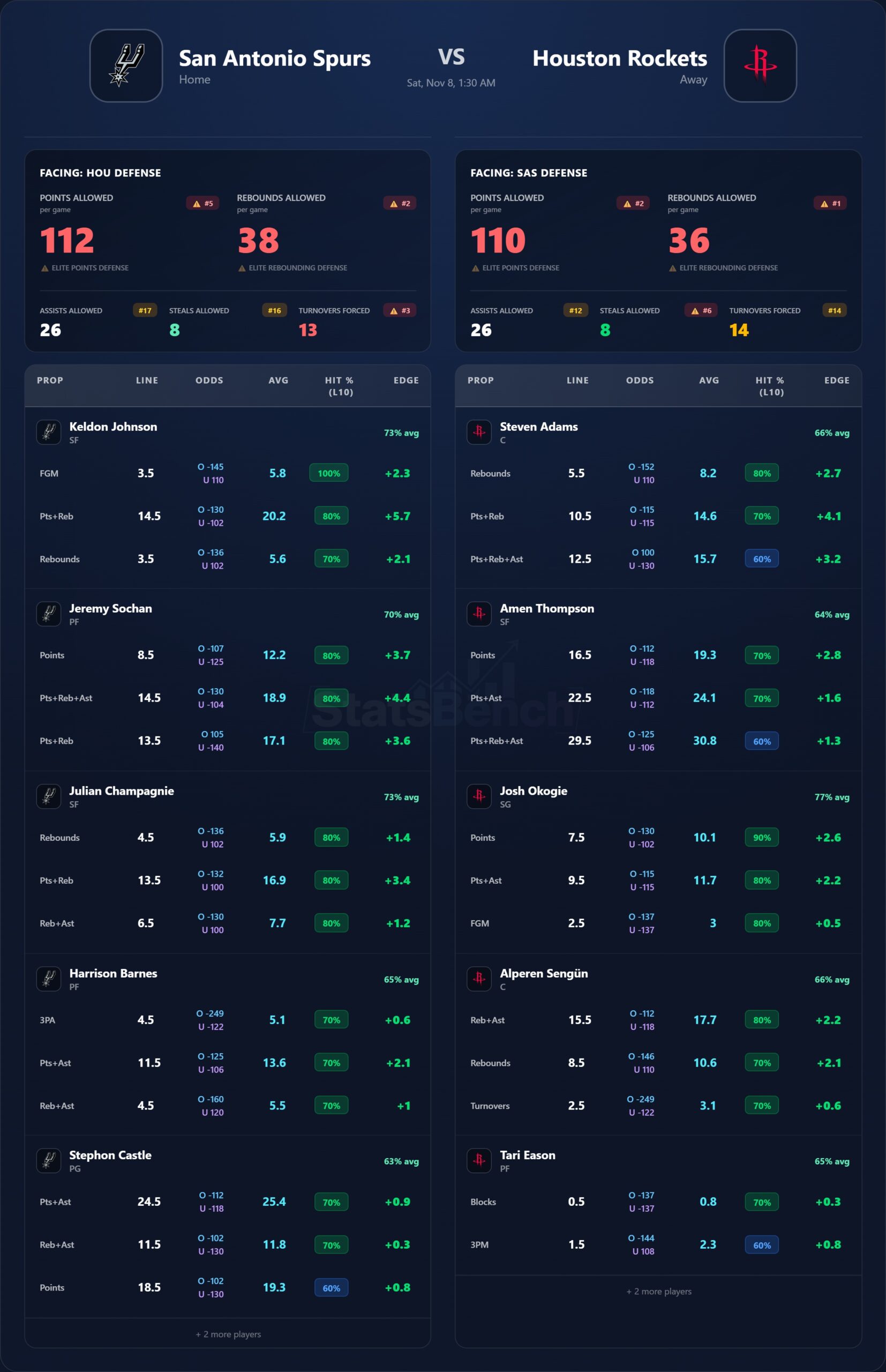 Matchup note: Sengün vs. Wembanyama (if active) would be elite, but San Antonio may rest Victor. Without him, Houston’s inside scoring has the advantage.