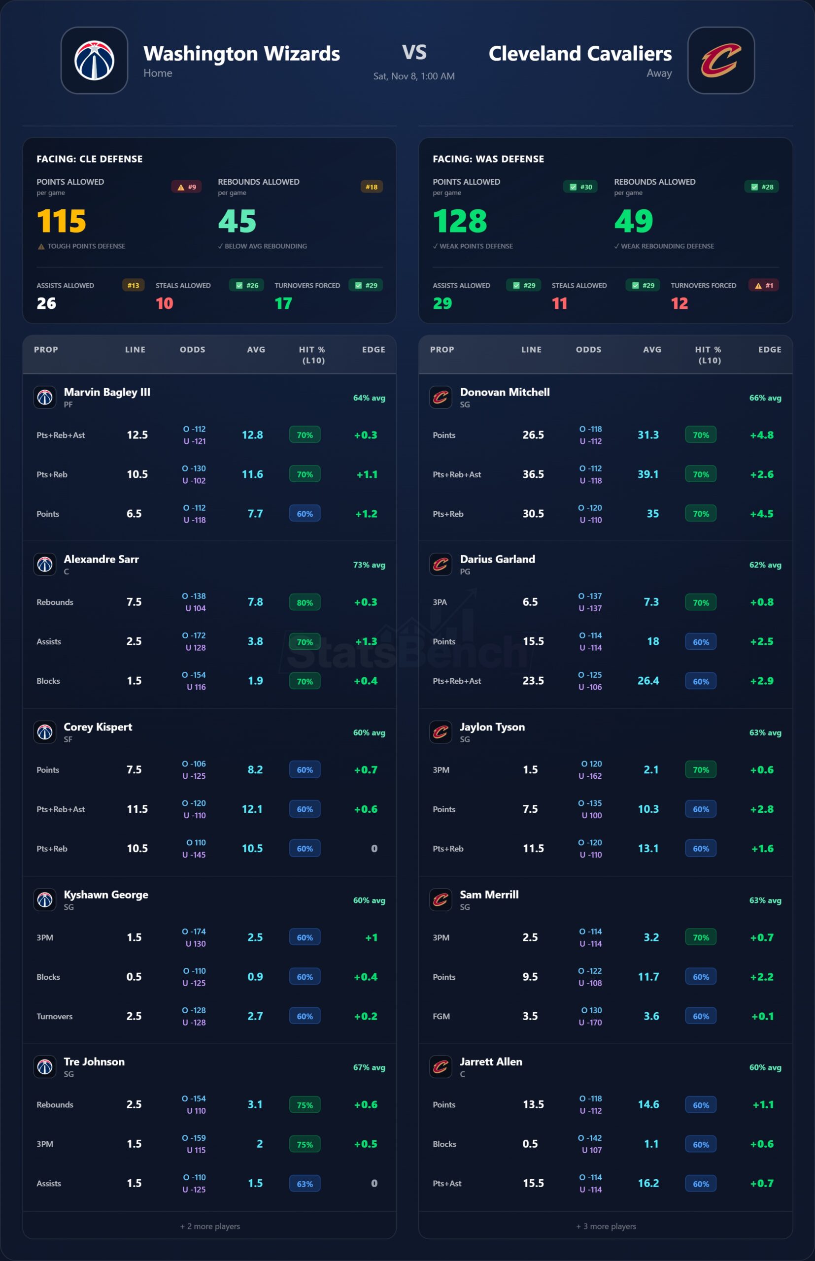 Matchup note: Cleveland’s guard duo vs. WAS backcourt is a mismatch; expect another high-efficiency night from Mitchell.